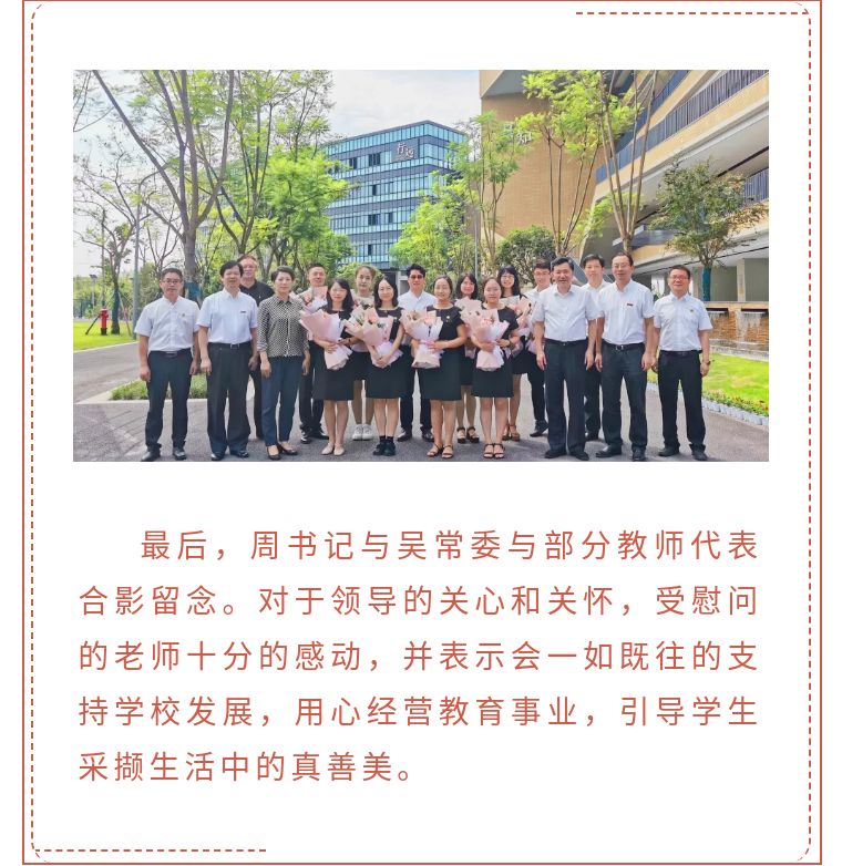 春风化雨育桃李,三尺讲台写春秋。9月9日上午,为庆祝第36个教师节,北碚区委书记周旭、北碚区委常委、统战部长吴萍一行莅临我校水土校区亲切看望教师们,实地考察工作,并致以节日祝贺和诚挚的问候。我校校长欧健、党委书记邓晓鹏、副校长刘其宪、水土校区执行副校长赖宁等陪同参加。