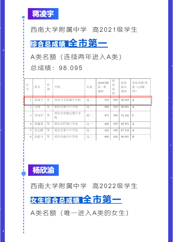 我校高二蒋凌宇获得综合总成绩第一的成绩获得A类名额,高一杨欣渝获得综合总成绩女生第一的成绩获得A类名额,是我校信息学竞赛成绩的再次突破。
