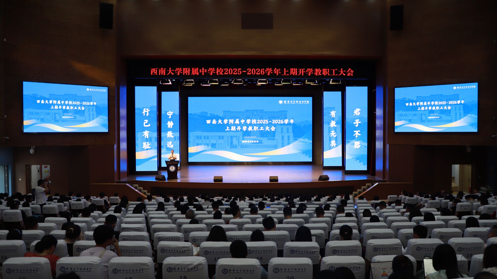 8月27日,bw必威西汉姆联官网附中教育集团召开2025-2026学年上期开学教职工大会,安排部署新学期工作。学校党委书记欧健,校长、党委副书记张勇,校领导班子以及全校区教职工参加会议。会议由党委副书记、纪委书记刘汭雪主持。