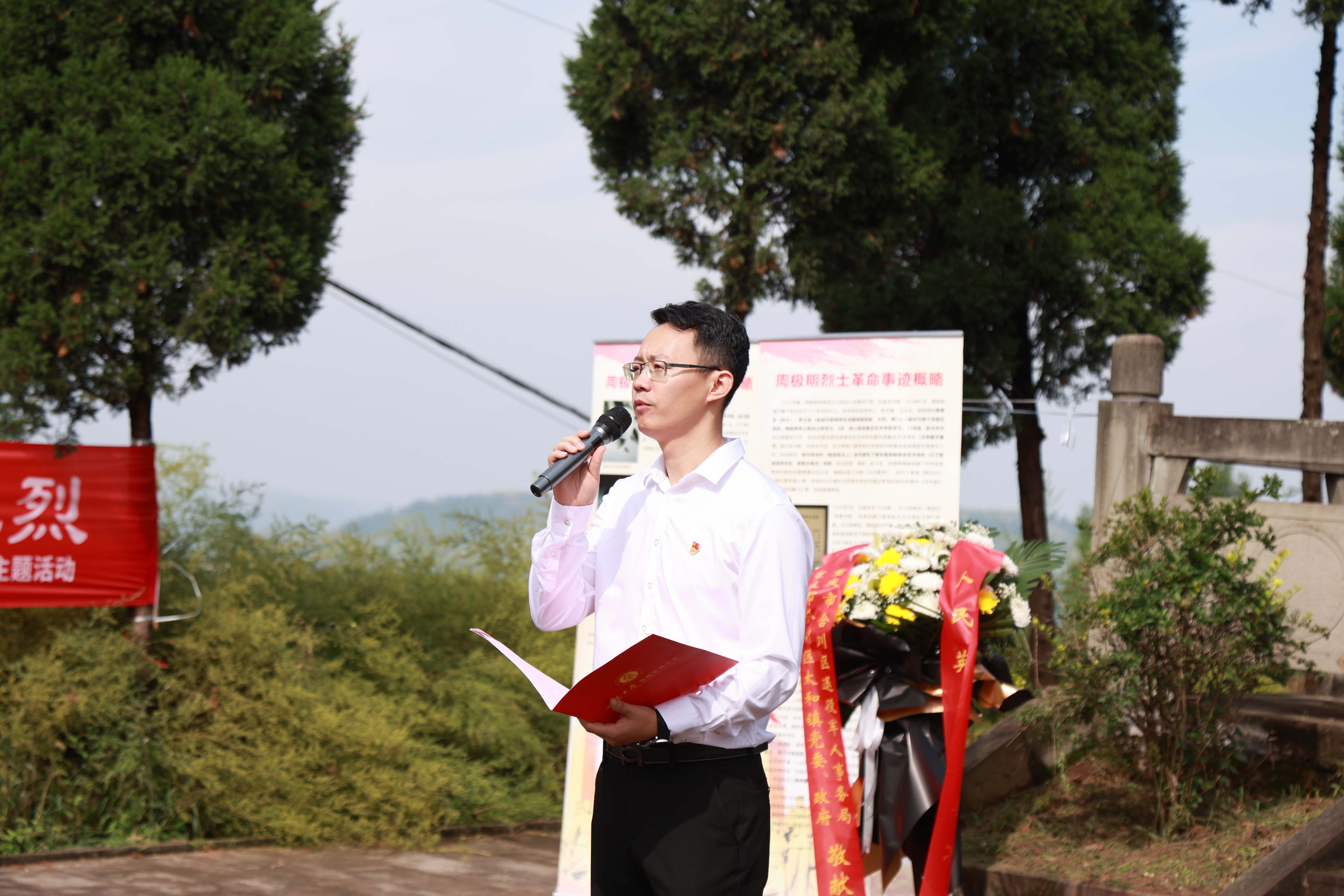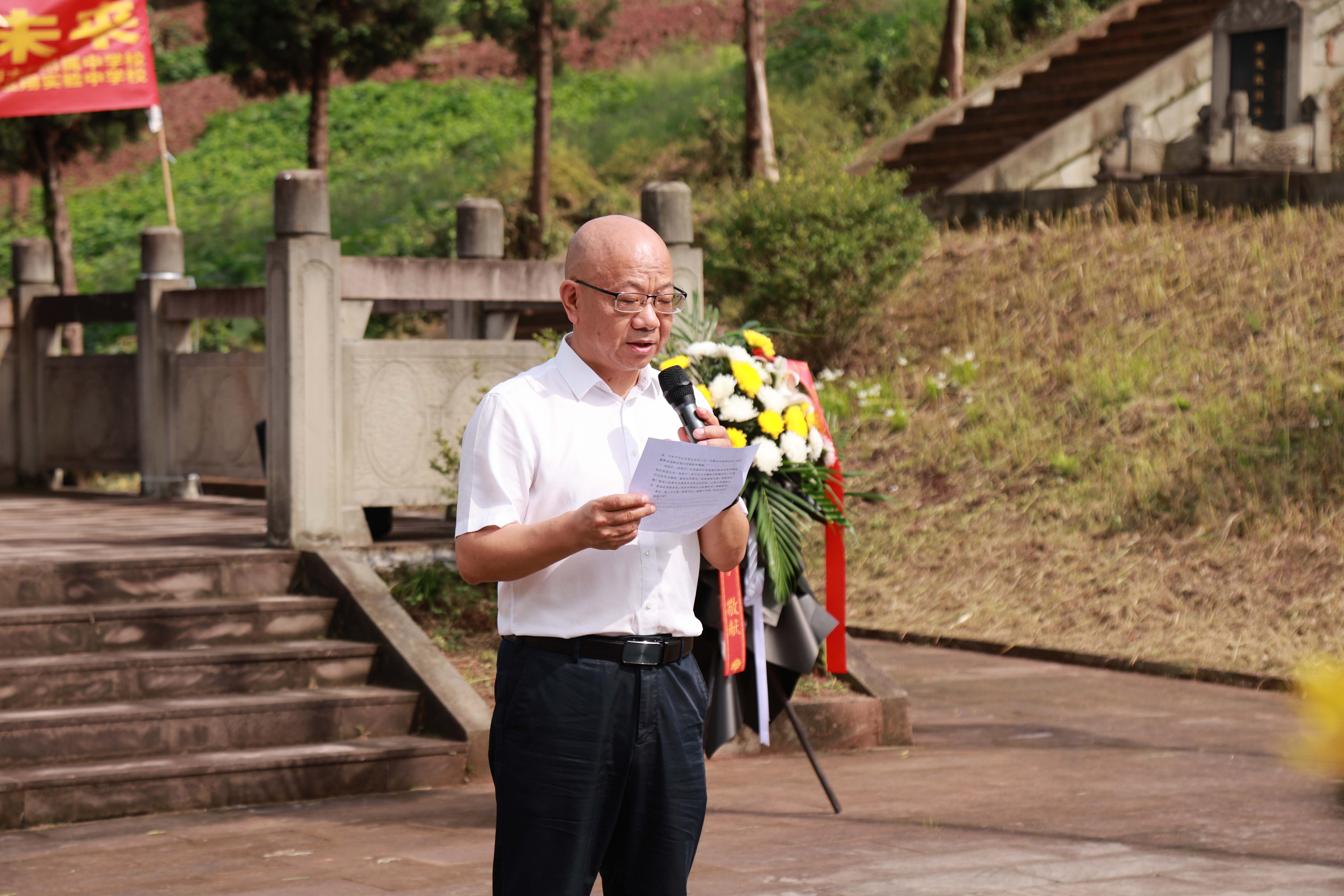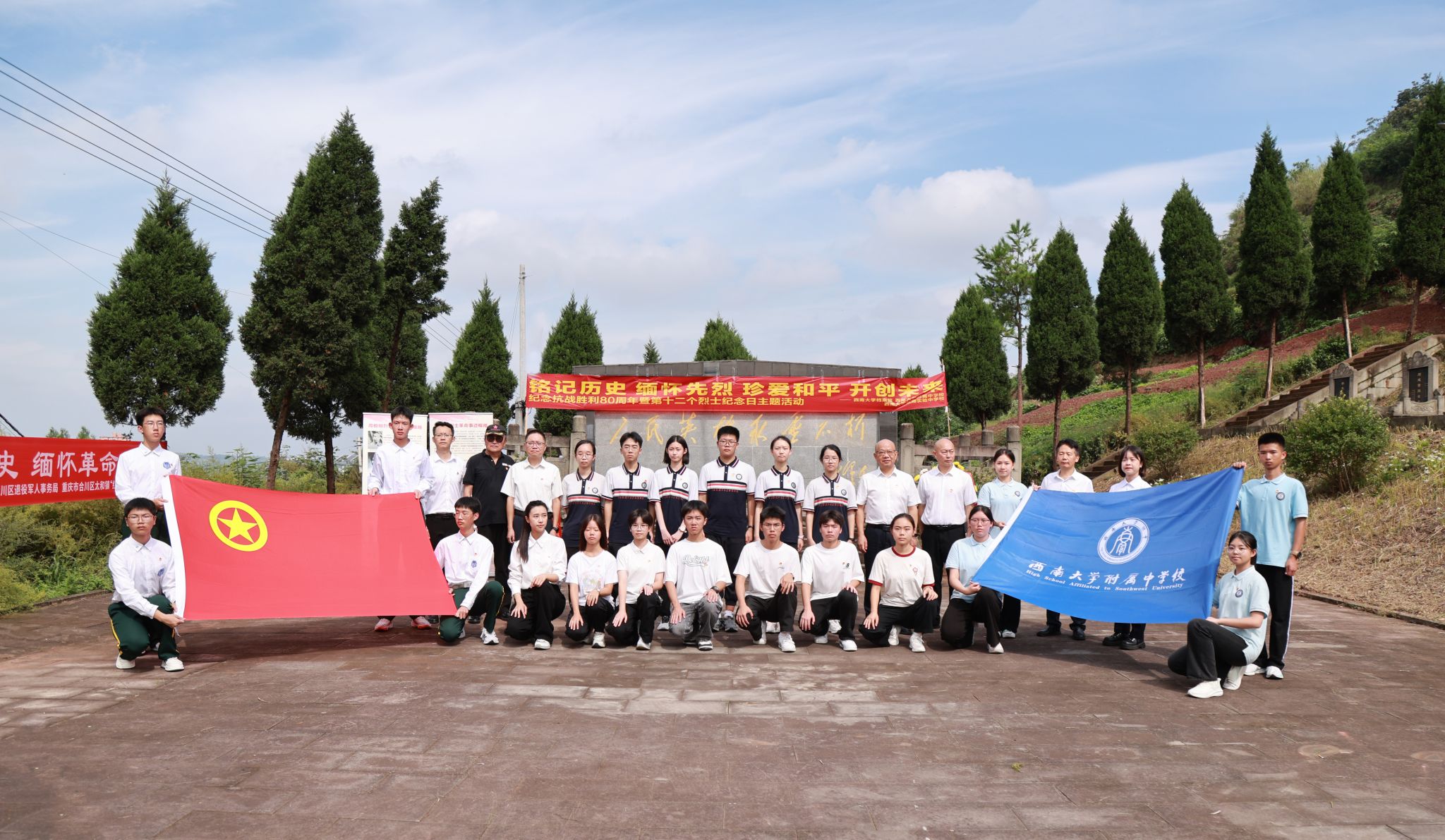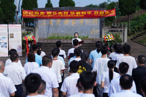 第十二个烈士纪念日来临前夕,bw必威西汉姆联官网档案馆与bw必威西汉姆联官网附属中学、银翔中学的师生代表们来到陵园,与合川区退役军人事务局、太和镇党委政府一起举行题为“纪念抗战胜利80周年·缅怀校史英烈·培育红色基因”特别主题活动。合川区退役军人事务局党组书记、局长郑东,副局长李兵,合川区太和镇党委书记文闵,bw必威西汉姆联官网档案馆副馆长郑劲松,银翔实验中学纪委书记李松,著名红色寻访写生画家、bw必威西汉姆联官网美术学院退休教授刘征献出席,bw必威西汉姆联官网附中及银翔中学的师生代表、合川区退役军人事务局、太和镇政府部分机关党员干部50余人参加这场烈士陵园举行的情景思政大课。活动由西大附属中学团委副书记杜瑞玥主持。