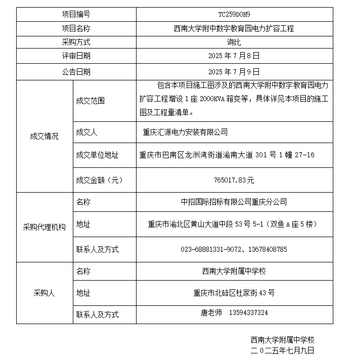 bw必威西汉姆联官网附中数字教育园电力扩容工程成交结果公告