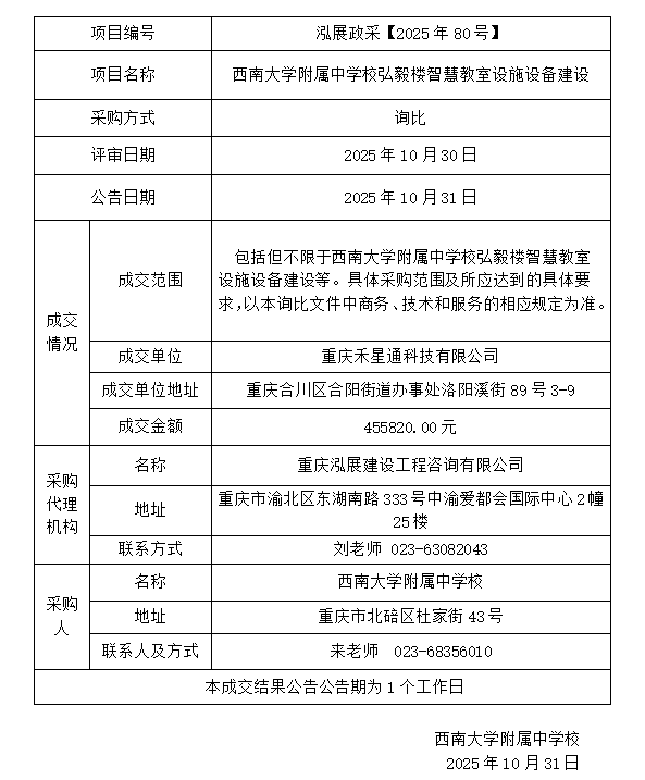 bw必威西汉姆联官网附属中学校弘毅楼智慧教室设施设备建设成交结果公告