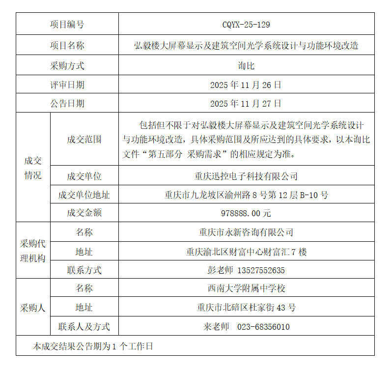 弘毅楼大屏幕显示及建筑空间光学系统设计与功能环境改造成交结果公告