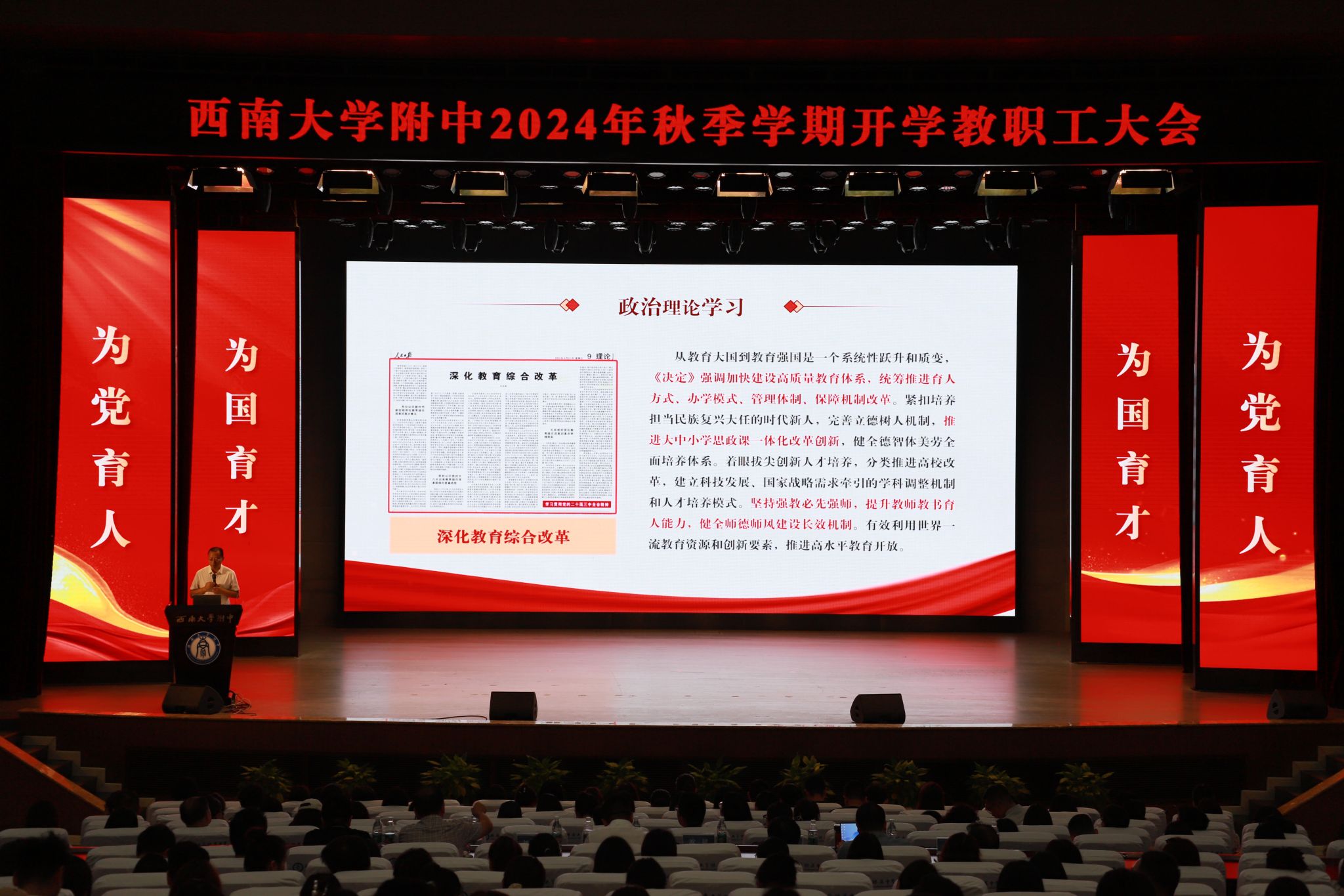 此次会议由校党委副书记、纪委书记刘汭雪主持,学校全体教职工参与,旨在深入学习贯彻党的二十届三中全会精神,并认真贯彻教育部等上级部门关于教育发展的新任务及新要求,以明确新学期工作方向,为学校的持续发展注入新动力。