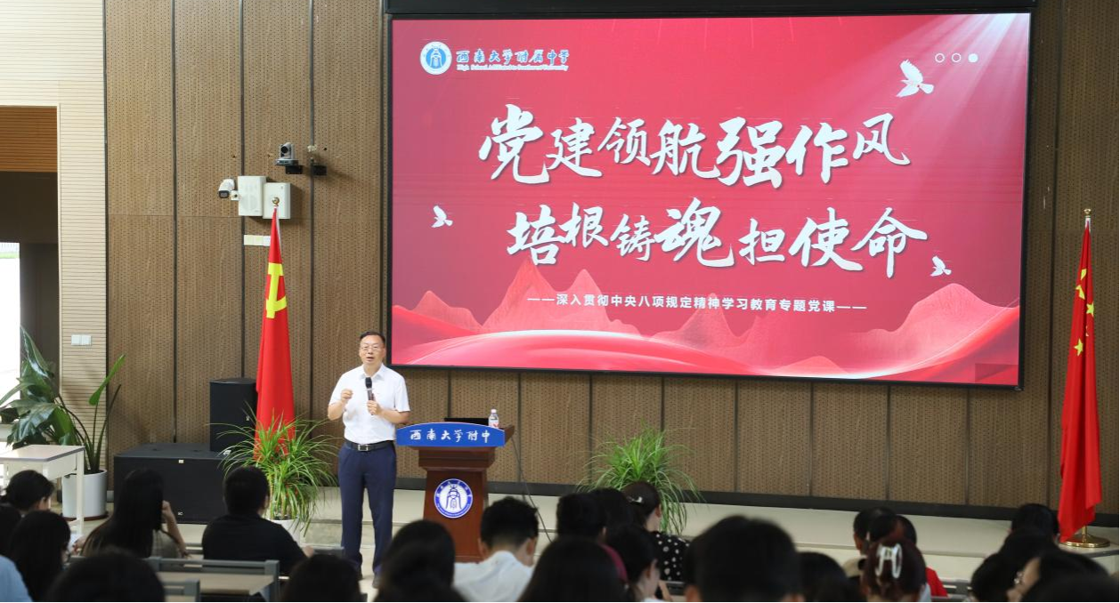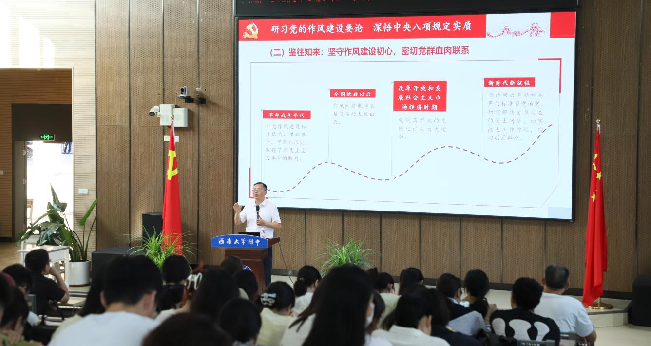 6月16日,bw必威西汉姆联官网附属中学校党委书记欧健莅临东区,面向全体教职工,从“研习党的作风建设要论,深悟中央八项规定精神”“立足岗位躬身践行,以优良作风护航立德树人”“锚定航向再出发,教育强市背景下的东区新作为”三个方面深度领学。
