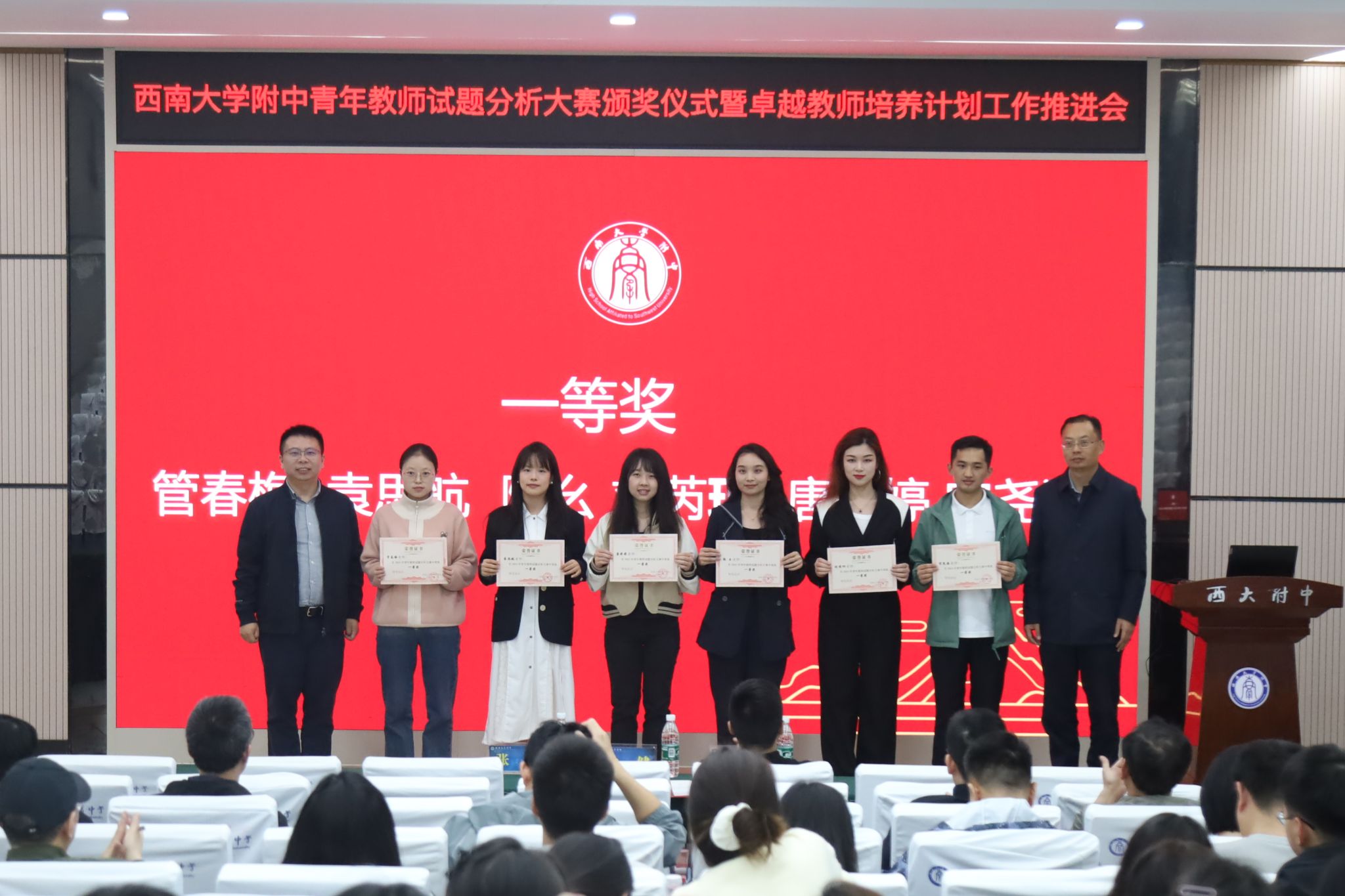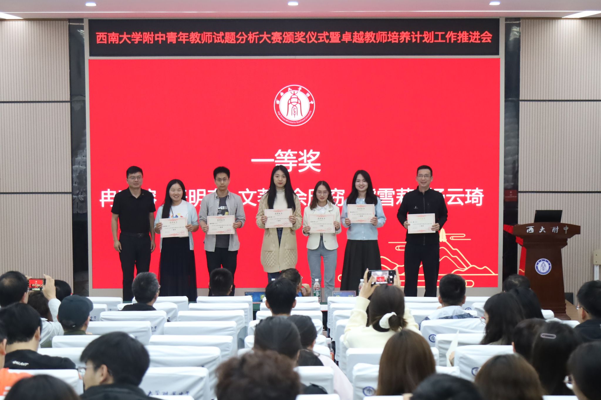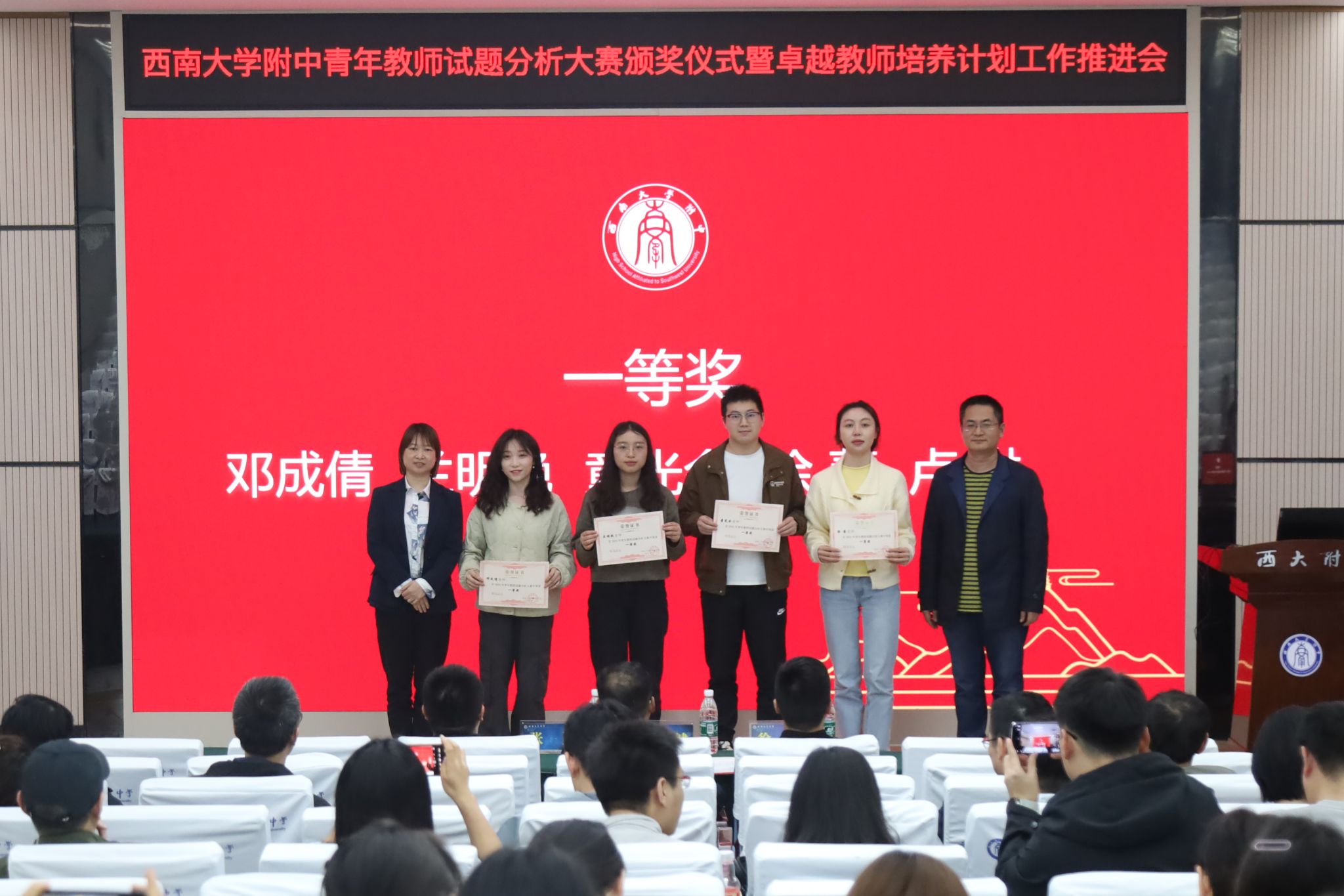 4月24日晚,青年教师试题分析大赛颁奖仪式在bw必威西汉姆联官网附中万象楼阶梯教室成功举行,学校党委书记欧健,校长、党委副书记张勇,副校长徐川及部分教研组长、获奖教师代表参加了颁奖仪式。