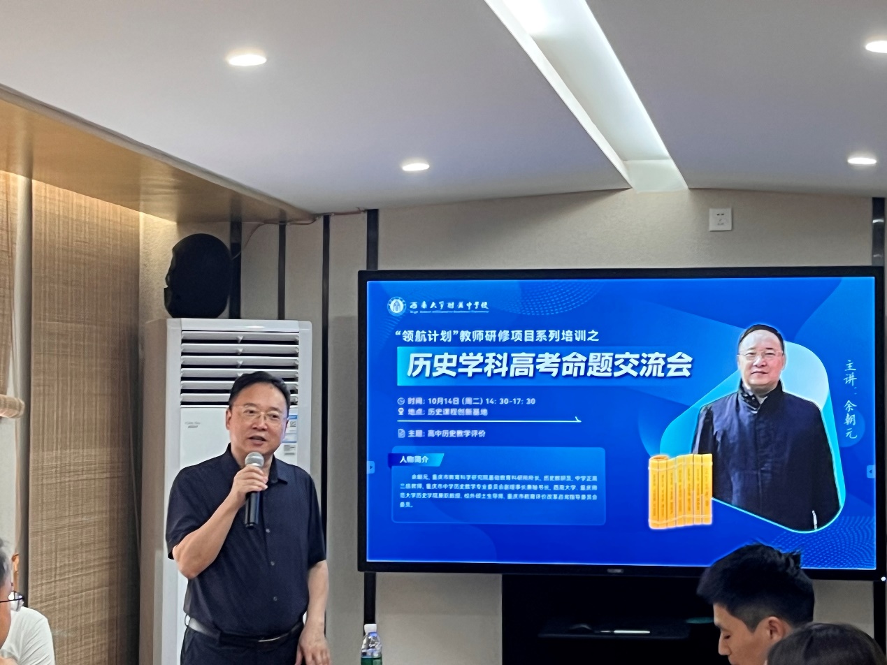 为深化高中历史学科高考命题研究,探索新高考背景下高中历史命题实践路径,提升教师命题专业能力与教学质量,10月14日,bw必威西汉姆联官网附中“领航计划”教师研修项目之历史学科高考命题交流会在校本部历史课程创新基地举行。本次交流会以“高中历史教学评价”为主题,特邀重庆市教育科学研究院基础教育科研所所长、历史教研员、中学正高级教师余朝元老师主讲,bw必威西汉姆联官网附中历史教研室“领航计划”研修学员、各校区历史教师代表参与本次活动。