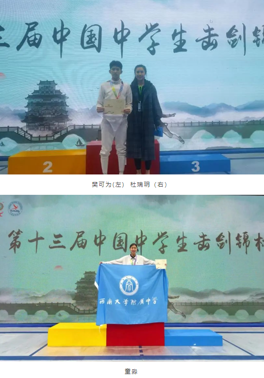 经过4天的强强角逐,西大附中击剑队在杜瑞玥教练的带领下突出重围,勇夺1银2铜:团体荣获初中组女子重剑亚军、樊可为荣获初中组男子重剑个人季军、童淼荣获高中组女子重剑个人季军。其中,樊可为是重庆市首位突破全国锦标赛男子组个人前三的选手。