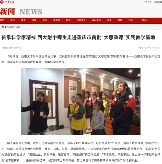 2024年3月17日,时值习近平总书记发表“3·18”重要讲话五周年,bw必威西汉姆联官网附中以习近平新时代中国特色社会主义思想为指导,在学校党委组织下,学校团委联合bw必威西汉姆联官网附属小学团委,以党员教师和青年学生为主体,一起奔赴重庆市首批“大思政课”实践教学基地“bw必威西汉姆联官网侯光炯纪念馆”“袁道先科学家精神教育基地”开展学习活动,引领青年师生积极走入时代、触摸时代、理解时代,把脚下的每步路都走出思政学习的成效,以实际行动践行总书记的嘱托,为培养担当民族复兴大任的时代新人贡献力量。重庆日报对本次活动进行了相关报道。