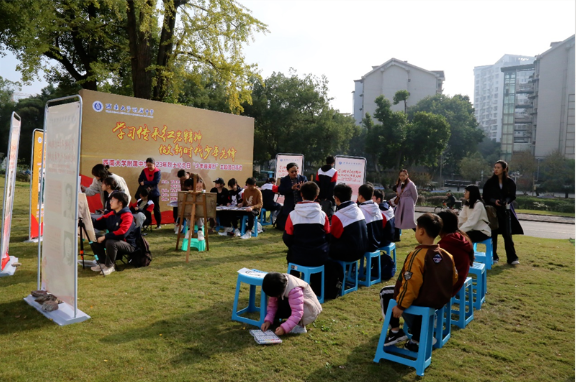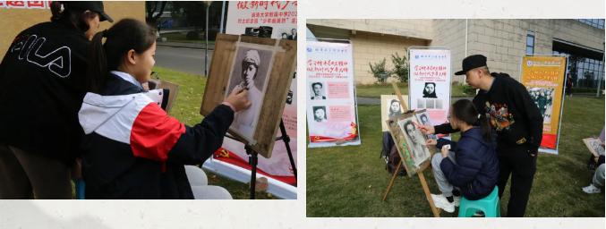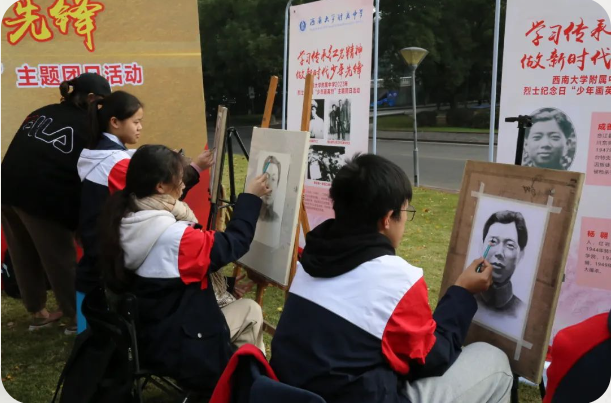 校史馆前的草坪上郑劲松馆长给同学们上了一堂生动的思政教育现场实践课,学生们聆听着著名英烈江姐当年联系国立女子师范学院的事迹,赞叹着陈诗伯、张泽浩等红岩烈士的革命英雄主义精神,学英雄,画英雄,追念英雄,致敬英雄。美创班的学生们架好画板,拿出画笔,满怀敬畏之心,开始一笔一笔地临摹先烈肖像。学生会成员则是拿出纸笔,写下了自己参加此次活动的感悟。孩子们的笔触满怀深情,“下笔春蚕食叶声”,一笔一划,触碰着我们身体的一个个细胞,激起了我们灵魂深处的一次次感动。