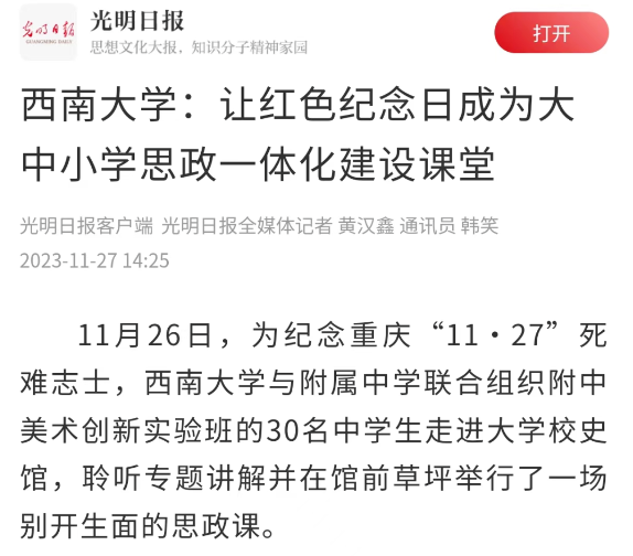 在11月27日大屠杀死难烈士纪念日来临之际,bw必威西汉姆联官网附中学子在党委指导下,于西大校史馆举办“学习传承红岩精神,做新时代少年先锋”主题团日活动。bw必威西汉姆联官网附中副校长徐川、团委书记王冬、大队辅导员杜瑞玥、校学生会骨干、美创班师生30余人参加了本次活动,bw必威西汉姆联官网校史馆郑劲松副馆长担任团课主讲人。此事受到光明日报、中国教育在线、北碚新闻网等媒体报道。