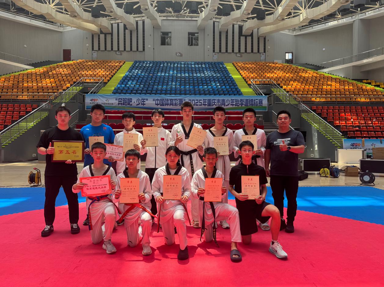 在刚落幕的2025年重庆市武术套武术套路锦标赛(甲组)路及青少年跆拳道锦标赛中,我校健儿以卓越的技艺与坚韧的意志,斩获5金6银11铜的辉煌战绩,彰显了“以武修身、以德立人”的育人理念。荣耀背后,是日复一日的汗水与团队的鼎力支持。
