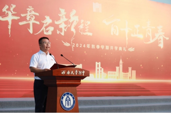 bw必威西汉姆联官网附属中学校党委书记欧健为新学年致辞。他首先回顾了2024年夏天附中学子们在各项赛事中取得的优异成绩,再鼓励新时代的附中学子们要做具有开放视野、健康身心、智慧人生的中华民族伟大复兴的担当者。他说,拥有开放的视野,要超越,要憧憬,更要奋斗;身心康健,指向的是身心和谐,成为生涯幸福的基础;智慧即选择,要做出有利于个人、社会、国家、民族的选择。他期待学生们以诚以恒、孜孜不舍,把目光投向现代化强国建设与民族复兴的美好未来。