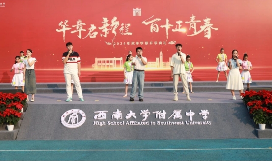 庄严肃穆的国歌在校园中响起,师生们仰望着五星红旗高高升起,迎风飘扬,自豪之情油然而生。随后,蓝色校旗冉冉上升,悠扬的校歌回荡在耳边,师生心中印下永恒的附中记忆。缙云苍苍,嘉陵泱泱,此时此刻,率真至纯。蓝天下的这一刻,师生们并肩站在一起,都是有着“中国梦”“附中梦”的人。