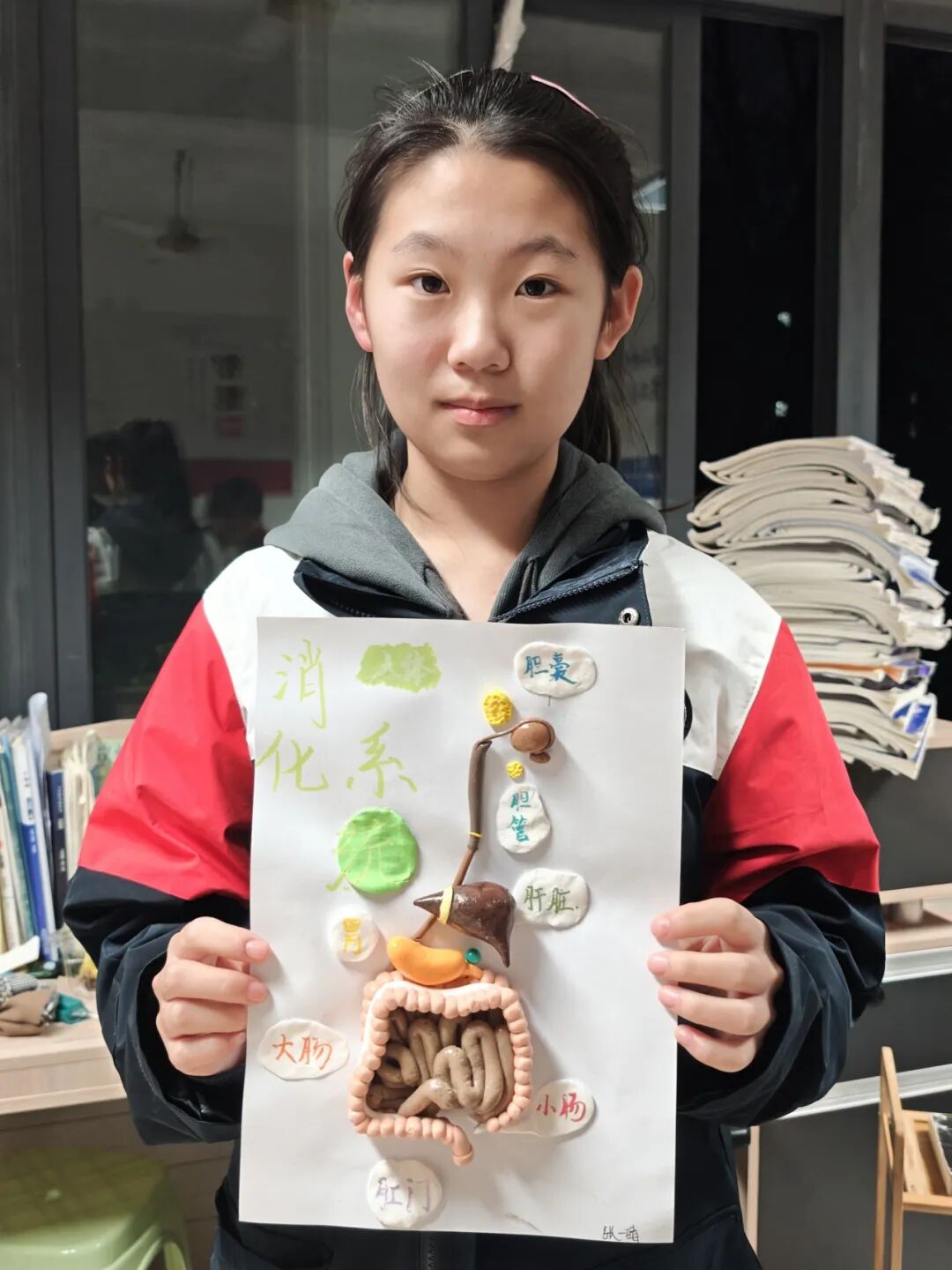 为了模拟胃的柔软和小肠的吸收面,我反复试验材料,思考连接。当我把最后一段“小肠”的褶皱粘好,这个亲手制作的消化系统模型终于完成,也让我恍然大悟,生物学不是死记硬背,是每个精巧结构都在诉说功能,是与生命设计最直接的对话。
