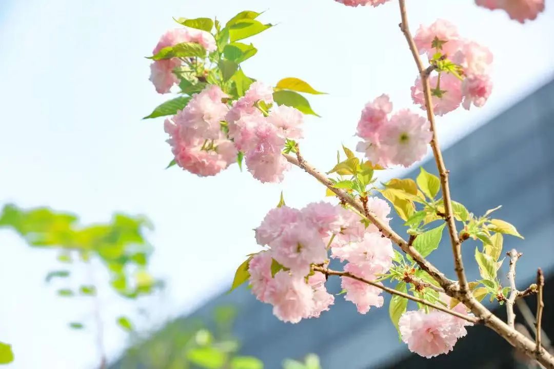 从思齐阶往下走。抬头,那棵碧桃总会在那儿迎接你。棕褐色的枝条载着满满的,娇翠欲滴的碧桃花越过木牌,活像一个调皮的小朋友总想往高处攀。这棵碧桃,既显眼,出入教学楼一眼就能看到;又落寞,是一片风景只一花的孤单。