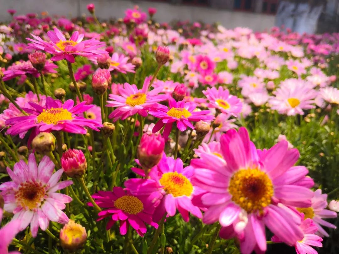 花团锦簇,相互依傍。在日光倾泻之时,显出华彩菲菲。每一片花瓣交织重叠,它胜在密匝匝。盛丽而娇怜的一捧,或粉或蓝,紧密的勾连,都仰头迎风沐光,春风拂过,安然。