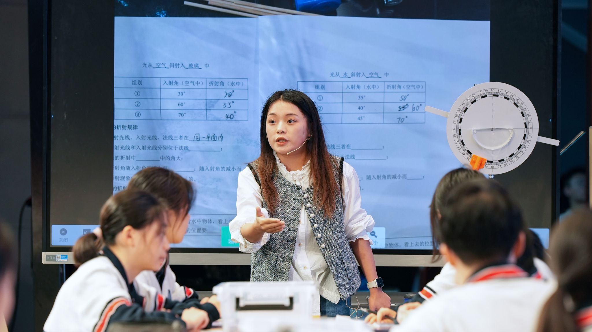 蒋琳老师以导光水瓶为引子,巧妙激发学生的好奇心与求知欲。通过分组实验,学生亲手探究光的折射规律,体验了科学发现的乐趣。蒋老师还结合河边的警示牌进行安全教育,通过插水果的小游戏,让学生在轻松愉快的氛围中感受折射的奇妙。此外,她还将亚运会导光管、坦克观察窗等实例融入课堂,与课前小游戏相呼应,使学生深刻体会到物理知识的实用价值,真正做到了寓教于乐。