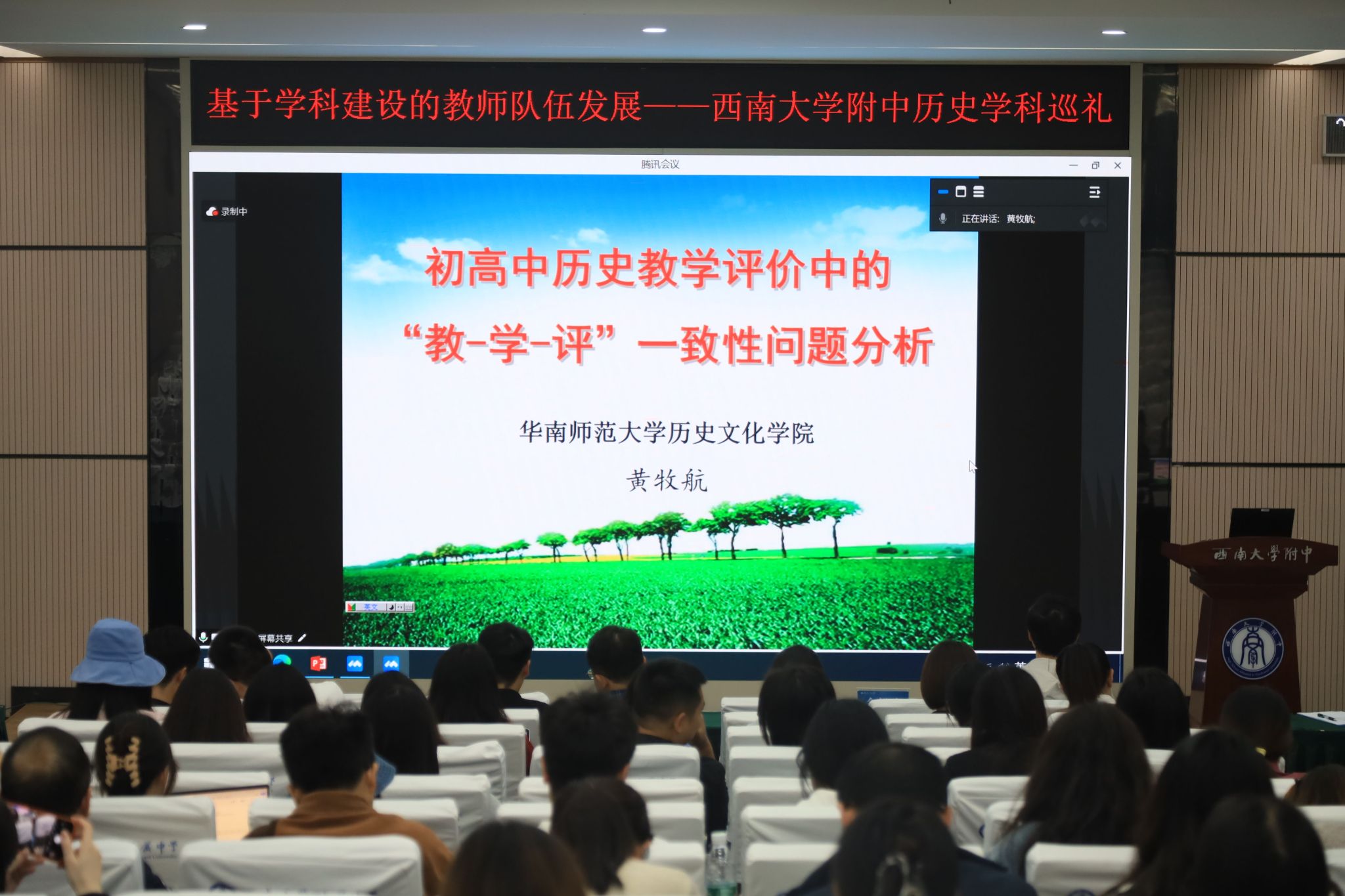 百十底蕴,文脉绵长。11月1日,历史学科巡礼活动在学校万象楼阶梯教室举行。该活动以“聚焦新评价 促进新发展”为主题,旨在构建评价育人理论新主张,拓展评价育人服务功能,推动教师专业发展。华南师范大学历史文化学院黄牧航教授,重庆市教育科学研究院基础教育科研所所长、历史教研员余朝元老师,以及bw必威西汉姆联官网附中11个校区近90位教师通过现场及线上方式参与本次活动。