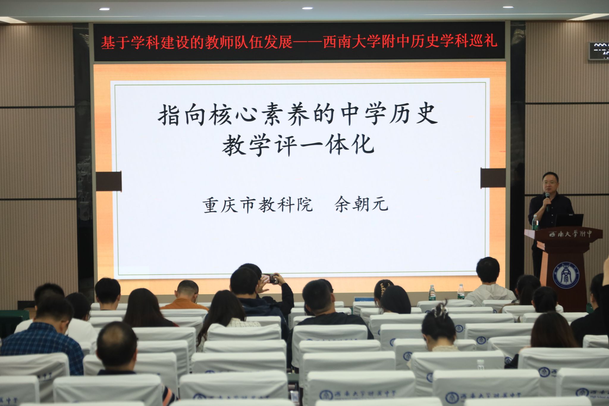 重庆市教育科学研究院基础教育科研所所长、历史教研员余朝元老师开展《指向核心素养的中学历史教学评一体化》的专题讲座。余老师首先解释了核心素养的概念与内涵,并强调历史课程的目标是落实立德树人根本任务,体现历史课程的育人功能,培养学生的核心素养。余老师围绕“什么是教学评一体化”“为什么要实行教学评一体化”“如何实施教学评一体化”这三个核心问题进行了深入探讨。余老师强调,要充分实现核心素养导向下的教学评一体化,就必须关注评价时间、评价依据、评价标准、评价载体、评价方法和评价主体,坚持育人理念,确定清晰的目标,设计与目标相匹配的评价任务,并及时向学生做出反馈或进行指导,以促进历史核心素养的有效落实。