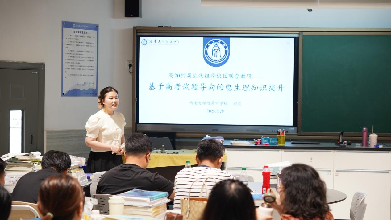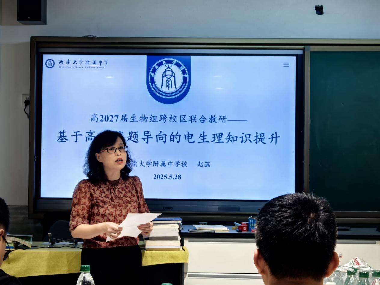 高2027届生物备课组于2025年5月28日举办跨校区联合教研活动,生物教研组长林艳华老师点评,全体生物教师及跨校区教研组成员参与,赵蕊老师以“教材对比——机制溯源——高考映射”为主线开展微讲座。生物教研组长林艳华老师肯定了讲座的专业性与实用性,指出电生理知识是高考难点,高中生物教师要通过学习深化知识,只有教师将“为什么”的原理理解透彻,才能更好地进行教学。她特别强调,教学中应聚焦学生常见误区,从高考试题的视角去突破原理,做好“考什么,教什么”的准备。