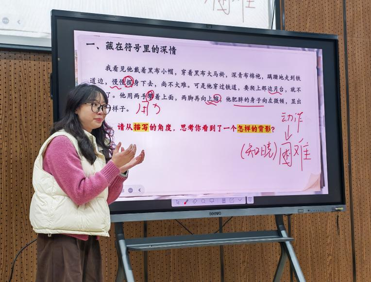 王梅老师的课程同样以文本细读为根基,围绕“以背影为锚点,悟藏于细节的父爱”这一核心主题展开。她首先引导学生聚焦车站送别段落,通过圈点批注父亲的动作、外貌等细节描写,让学生在文字肌理中感知父爱朴素、厚重又温暖的特质,读懂经典“背影”承载的深层温情;接着,她巧妙搭建文本与生活的联结,结合学生自身的成长体验,由文中父亲的付出延伸至生活中父母的点滴关怀,深化学生的情感共鸣;最后,她引导学生理解亲子间“情感的错位与平衡”,让大家明白“爱并非完美无瑕,唯有多一份理解与包容,才能读懂父母付出的深意”。