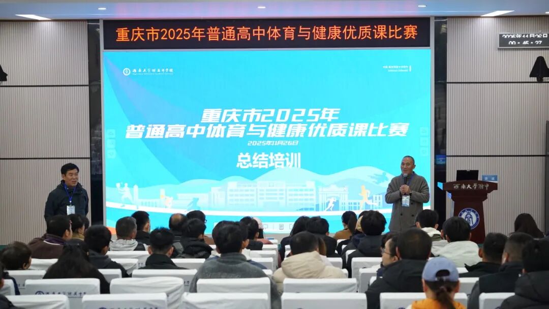本次总结培训环节由评委组组长、彭水县体育教研员郭云飞主持,忠县体育教研员谈斌,沙坪坝体育教研员杨永春,南岸区体育教研员张俊与附中体育组教师、北碚区学校代表教师共同参与。