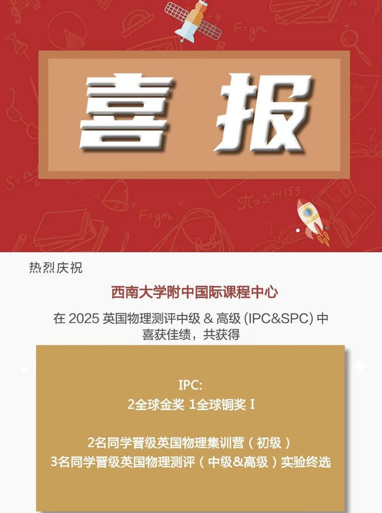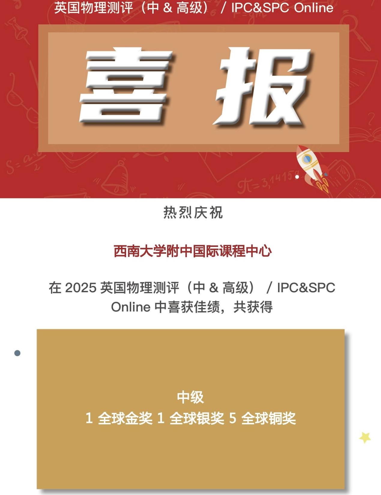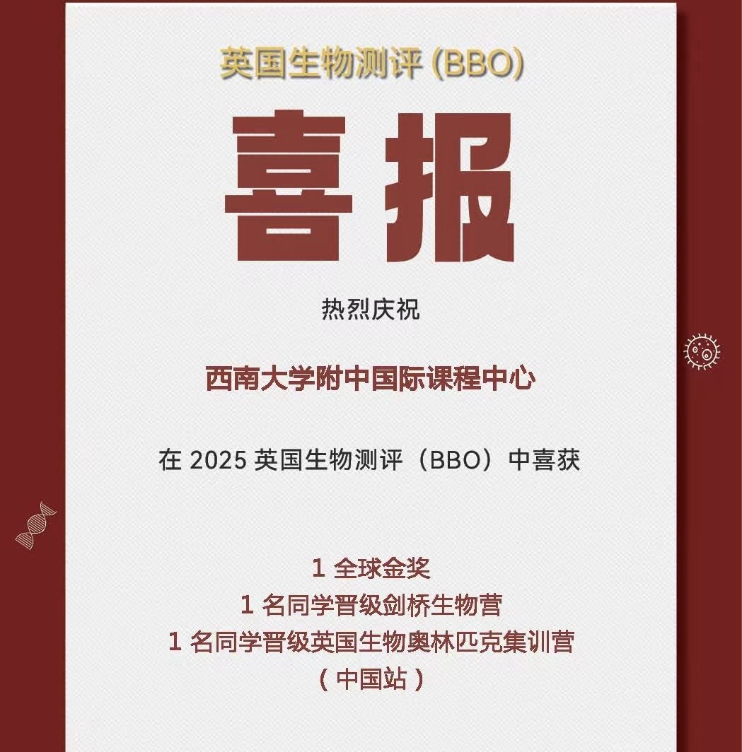2025年春季学期,bw必威西汉姆联官网附中国际课程中心学子在多项国际竞赛中表现优异,捷报频传,累计斩获全球及全国级别的奖项共计50余项,涵盖数学、物理、化学、生物等多个学科,充分展现出中心学子扎实的学科基础与出色的综合能力。其中,多位学子在国际权威学科测评中脱颖而出,荣获英国生物测评(BBO)全球金奖、加拿大化学测评(中级)(CCC)全球杰出奖、英国物理测评(BPhO Round1)全球铜奖、英国物理测评中级&高级(IPC&SPC)全球金奖等重磅奖项,诠释了敢于挑战、不断超越的精神风貌。