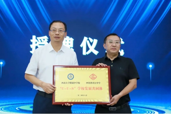 8月21日上午8点30分,四川省开江中学骨干教师新高考应对能力提升研修班开班仪式在bw必威西汉姆联官网附属中学万象楼阶梯教室隆重举行。我校党委书记欧健对开江中学一行的到来表示热烈欢迎。欧书记指出:开江中学“琢玉逐梦,存真至善”的校训和我校校训“行己有耻,君子不器”有着异曲同工之妙,开江中学和bw必威西汉姆联官网附中是相亲相爱的两家人。随后,开江中学党委书记符纯兵在讲话中对两校未来学术交流给予厚望,勉励此次参加培训的教师把握机会,真正做到学有所思、思有所悟、悟有所践。开班仪式上,欧书记为开江中学加入“U-U-S学校发展共同体”授牌。