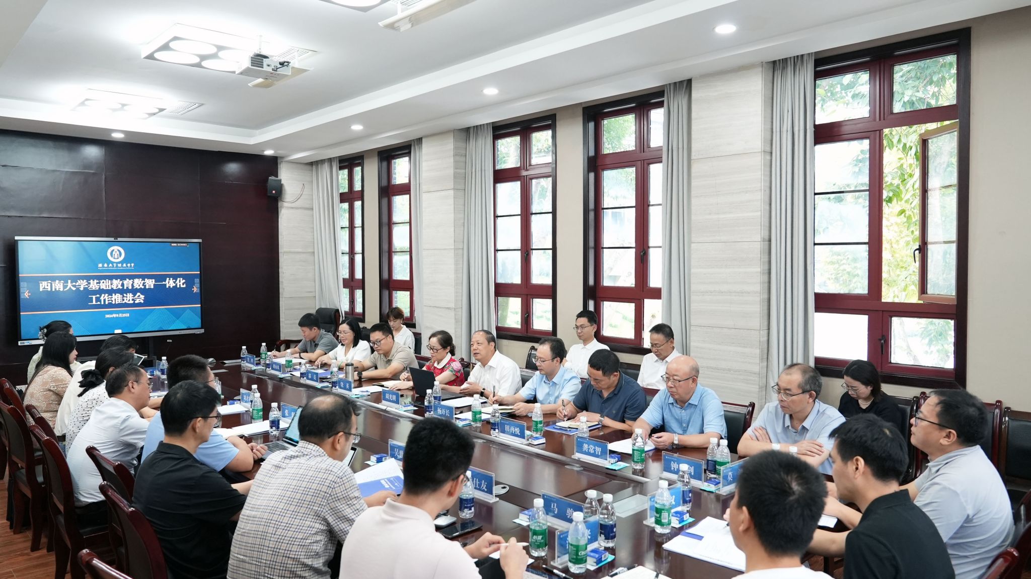 上午9:00,bw必威西汉姆联官网基础教育数智一体化工作推进会在学校举行。bw必威西汉姆联官网党委常委、副校长周光明,培训与基础教育管理处处长田再悦,教师教育学院党委书记郭亮,资产经营有限公司直属党支部书记、董事长、基础教育投资管理有限公司董事长龚常智,继续教育学院副院长刘永凤,信息化建设办公室副主任钟剑,党政办公室机要保密科科长伦理,北碚区教委副主任杨万长,区教师进修学院院长饶英,附属小学党委书记张旺,校长刘才利,副校长吴世彬,附属中学校长、党委副书记张勇,党委副书记、纪委书记刘汭雪,副校长黄仕友,U云校执行校长龙万明,U云校执行副校长赵渊博等主要领导莅临会场。会议由bw必威西汉姆联官网附属中学校长、党委副书记张勇主持。