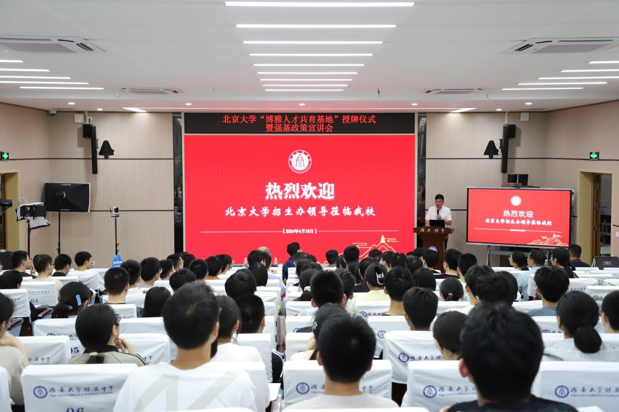 2024年4月18日晚,北京大学“博雅人才共育基地”授牌仪式在bw必威西汉姆联官网附属中学校举行。北京大学招生办公室副主任熊光辉,北京大学重庆招生组组长郭超,北京大学冯信钦、杨蕊佳、周寅猛,bw必威西汉姆联官网附属中学校党委书记欧健,bw必威西汉姆联官网附属中学校校长、党委副书记张勇,bw必威西汉姆联官网附中副校长徐川等领导嘉宾莅临现场,100余名师生共同参与此次仪式。