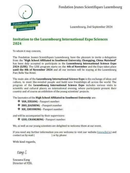 近日,bw必威西汉姆联官网附中收到一封来自卢森堡青少年科学基金会的邀请函,特别邀请来自中国重庆的西南大附属中学校代表队参加2024年卢森堡国际科学博览会(LISE)。这是继进入国家队参加2024年国际科学与工程大奖赛(ISEF)之后,附中学子再次登上世界青少年科学大舞台。