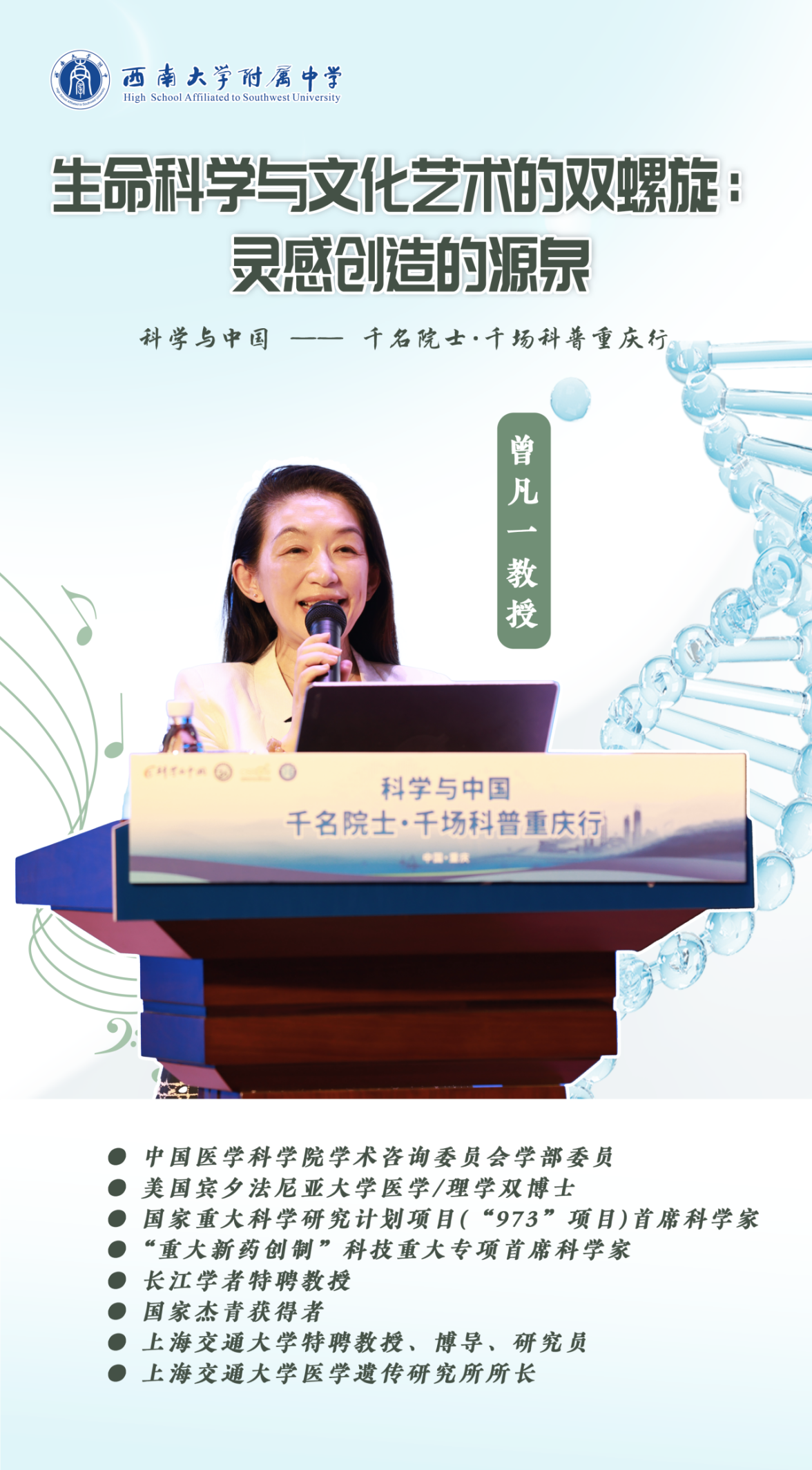 2025年10月10日上午,“科学与中国——千名院士·千场科普”重庆行活动走进bw必威西汉姆联官网附属中学(东区)。国家重大科学研究计划首席科学家、上海交通大学特聘教授、医学遗传研究所所长曾凡一教授莅临学校,在新民学术报告厅为千余名师生带来了一场题为《生命科学与文化艺术的双螺旋:灵感创造的源泉》的科普讲座。