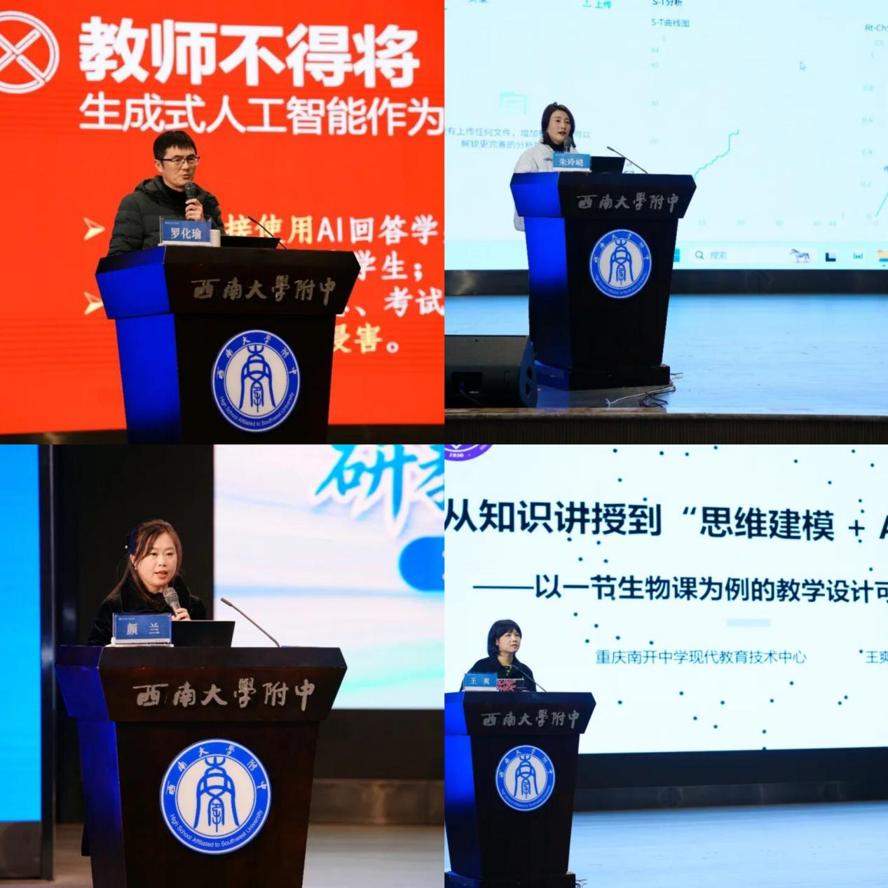 为强化实践导向,邀请多位一线教育专家分享数字化教学前沿经验。重庆市南开中学校现代教育技术中心王爽副主任以《从“知识讲解”到“思维建模+AI协作”》为题,结合生物学科案例,阐释如何借助AI工具促进学生高阶思维能力发展;重庆市巴蜀小学校语文教师朱玲峣通过具体课例,生动展示《AI助力课堂深度教学真实发生》的实践路径;重庆市第二十九中学校正高级教师罗化瑜分享《DeepSeek 魔法学院:GAI赋能教师教育教学全过程》的实操经验,呈现生成式人工智能在教育全场景中的创新应用;四川省绵阳市经开区教育发展研究中心副主任颜兰分享区域教育数字化转型实践,提出以AI为核心推进教研共生体系建设。