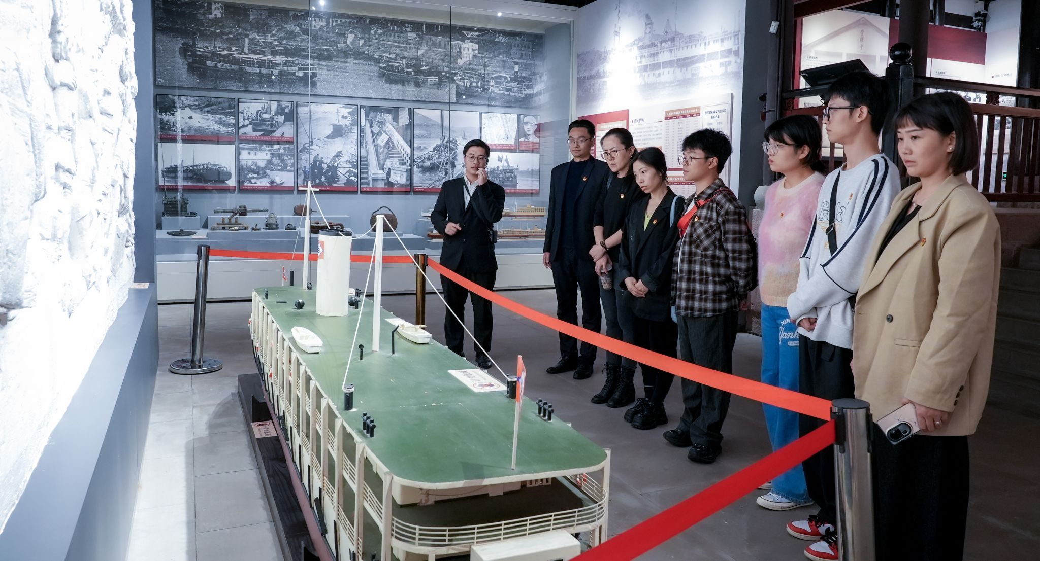 在场馆参观环节,党员教师们在讲解员的带领下,一同走进“中国船王”“北碚之父”卢作孚的一生。20世纪上半叶,国际形势风云变幻、中国历史变革波澜壮阔,作为中华民族危难中涌现出的爱国企业家典范,他心怀国家、创办产业,成立民生公司,走上实业救国之路;他救亡图存、铁血西迁,组织了被誉为“中国实业上的敦刻尔克”——宜昌大撤退,保存了中国民族工业命脉;他顾全大局、勇担大义,带领滞留香港和海外船舶驶返内地,主动把民生公司交给国家,是一代“船王”,一位“没有钱的大亨”。卢作孚的一生先后跨越“革命救国”“教育救国”“实业救国”三大领域,是爱国为民、创新图强、崇德重信、兼善天下、放眼世界的实干家,是发展实业、启迪民智、建设乡村、改造社会的开拓者,这种精神,无不感染着在场参观的所有教师们。