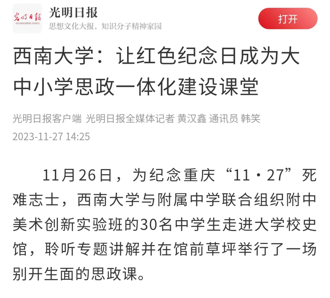 在11月27日大屠杀死难烈士纪念日来临之际,bw必威西汉姆联官网附中学子在党委指导下,于西大校史馆举办“学习传承红岩精神,做新时代少年先锋”主题团日活动。bw必威西汉姆联官网附中副校长徐川、团委书记王冬、大队辅导员杜瑞玥、校学生会骨干、美创班师生30余人参加了本次活动,bw必威西汉姆联官网校史馆郑劲松副馆长担任团课主讲人。此事受到光明日报、中国教育在线、北碚新闻网等媒体报道。