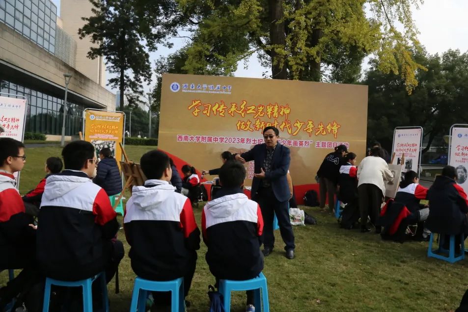 校史馆前的草坪上郑劲松馆长给同学们上了一堂生动的思政教育现场实践课,学生们聆听着著名英烈江姐当年联系国立女子师范学院的事迹,赞叹着陈诗伯、张泽浩等红岩烈士的革命英雄主义精神,学英雄,画英雄,追念英雄,致敬英雄。美创班的学生们架好画板,拿出画笔,满怀敬畏之心,开始一笔一笔地临摹先烈肖像。学生会成员则是拿出纸笔,写下了自己参加此次活动的感悟。孩子们的笔触满怀深情,“下笔春蚕食叶声”,一笔一划,触碰着我们身体的一个个细胞,激起了我们灵魂深处的一次次感动。