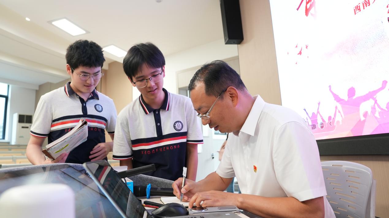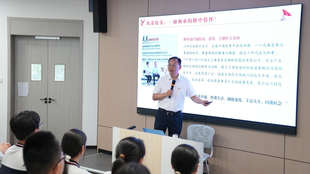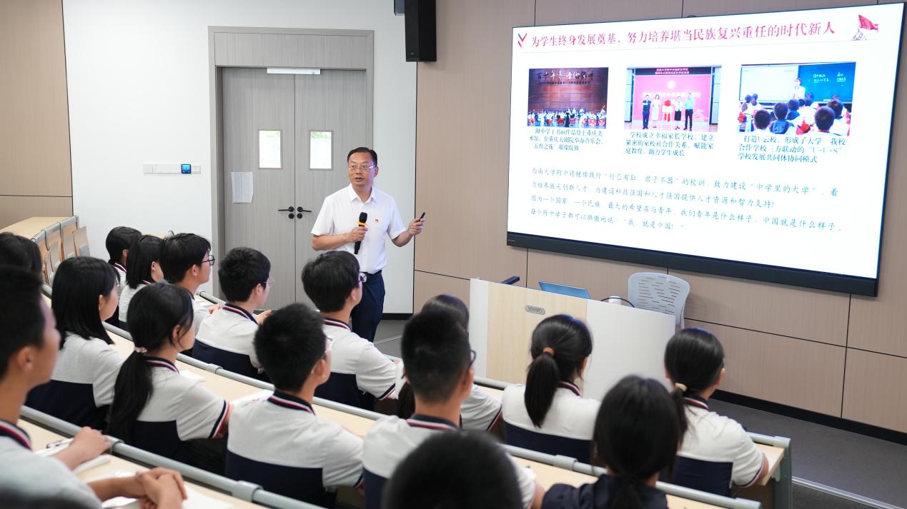 特别值得一提的是,欧书记重点介绍了三位杰出校友的成长故事:初2006届校友储卫民成为首位获得美国国家地理摄影大赛全球总冠军的中国摄影师;高2009届校友吴程臣在音乐创作领域坚持文化自信,将巴渝文化融入现代音乐创作;高1987届校友洪伟、王继红夫妻俩带着母校的教诲与期望,专注于生物技术领域的探索与创新.这些生动案例深刻诠释了“行己有耻,君子不器”的校训精神。