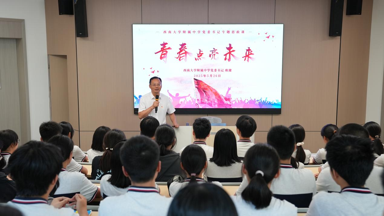 铸魂育人担使命,培根固本启新程。为深入贯彻落实新时代学校思政课建设推进会精神,引导同学们将社会主义核心价值观内化于心、外化于行,助力莘莘学子锚定远大理想目标,坚定信念、勇毅前行。2024年5月26日下午,bw必威西汉姆联官网附属中学逸夫楼一楼阶梯教室内座无虚席,一场以“青春与使命”为主题的专题思政课在此隆重举行。bw必威西汉姆联官网附属中学党委书记欧健以《青春点亮未来》为主题,为全校非毕业年级学生干部开设一堂立意高远、内涵深刻的思政课。
