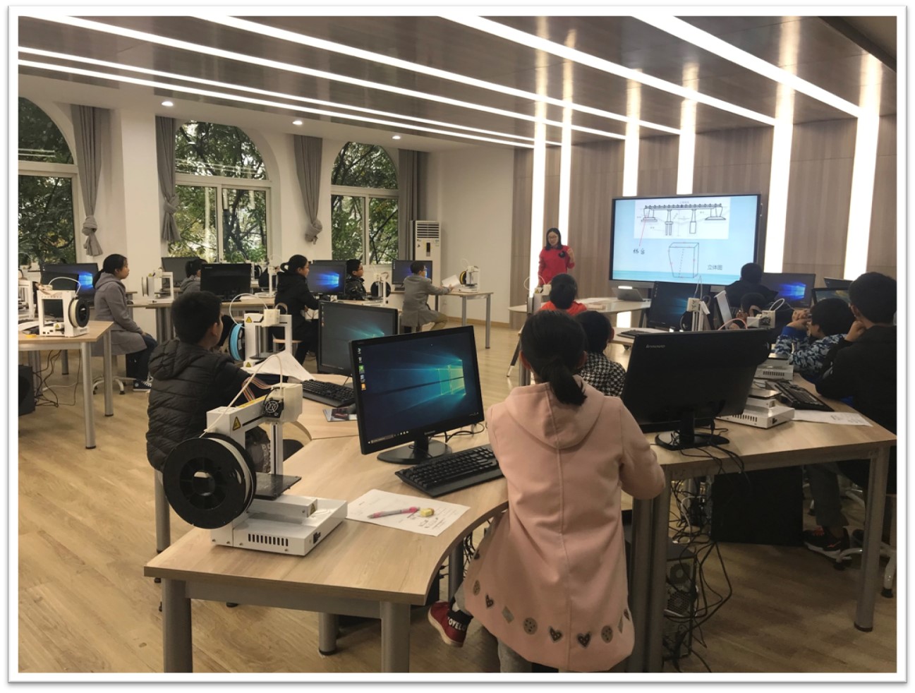 整个STEAM中心的其他实验室又是针对于每一个板块建立大班化教学的空间,比如:机器人实验室、3D打印实验室、电子工程实验室、技术设计室、技术实验室、财商实验室等等,利用通识课程和选修课程让更多的学生参与到过程中来,更大化的利用空间,更大化的开展STEAM教育。